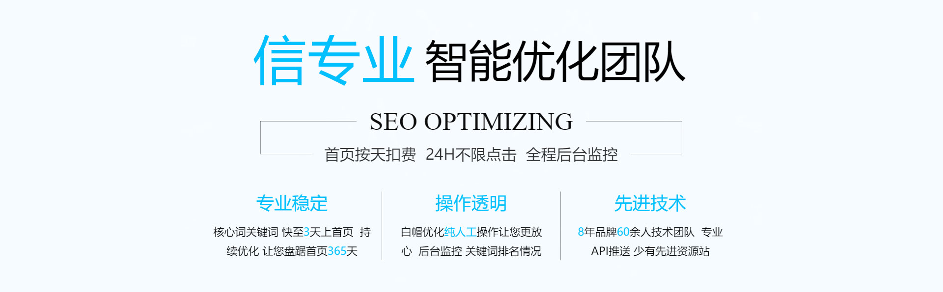 關(guān)鍵詞優(yōu)化,無(wú)效果退款!專(zhuān)業(yè)技術(shù)管控賬戶(hù),減少無(wú)效點(diǎn)擊,全方位網(wǎng)絡(luò)推廣,讓您的信息遍布互聯(lián)網(wǎng)。